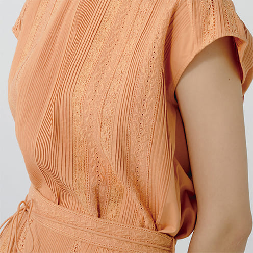 素材は、インド産のレーヨンジョーゼットを使用しています。独特の透け感とドレープが特徴のこの素材に、小さな花びらのような刺繍を2色で重ねていきました。