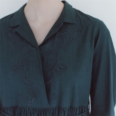 刺繍図案は、地層にのみ込まれた貝殻や植物など様々に絡み合う自然の生きものたちをイメージして、書き起こしました。生地はオーガニックコットンを使用し、独特のシボ感やネップの風合いが残る、インドならではのしっかりとした平織りに仕上げています。