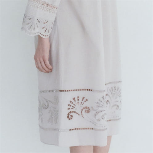 テープやリボンなどの様々な素材をステッチで縫い付ける手法を「コード刺繍」といいます。古くはヨーロッパのエンブレムにも用いられた立体感のある仕上がりが特徴の刺繍です。インドでは現在もなお、この刺繍技術が残っており、まるで絵を描くように、熟練の職人たちが古い刺繍ミシンを使い、1点1点、フリーハンドで刺繍を施します。この‘Natalija’は、コード刺繍の力強くも繊細な美しさを表現したシリーズです。