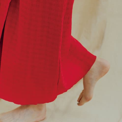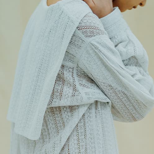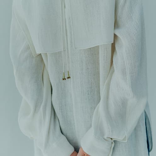 素材は、テーブルクロスを思い起こさせる、綿と麻をミックスした平織りで仕上げています。少し透け感がありながらも程よい薄さの生地は、刺繍を浮き立たせ、美しさを引き立てています。