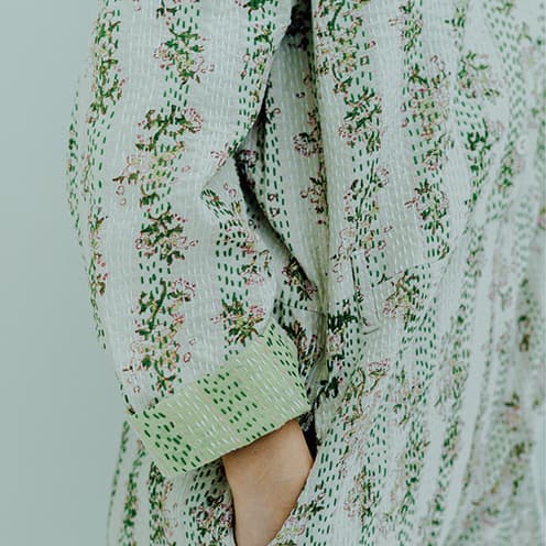 刺繍図案は、様々なスパイスに使われる植物をイメージし書き起こしました。生地に写した図案の上から、まるで絵を描くように、1点1点フリーハンドで刺繍しています。裾や襟端に入った波状の刺繍は、1点ずつ生地を手作業でカットして処理しています。年代物のテーブルクロスが醸し出すような、温かで繊細な美しさを目指しました。