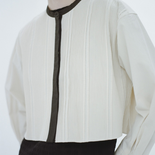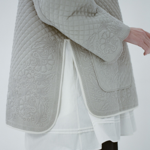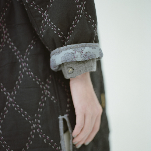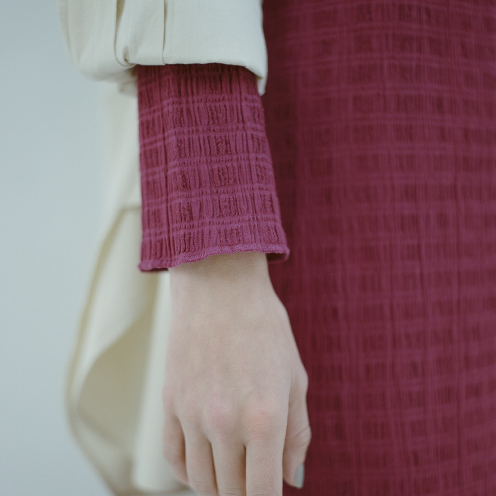 これまでのコレクションで作製してきた繊細なレースやタックの柄を、ニットでも表現したいと考え、様々な細かい編み柄を組み合わせました。ヒンディー教の寺院やお祝いに欠かせない花輪も、編み柄に取り入れています。