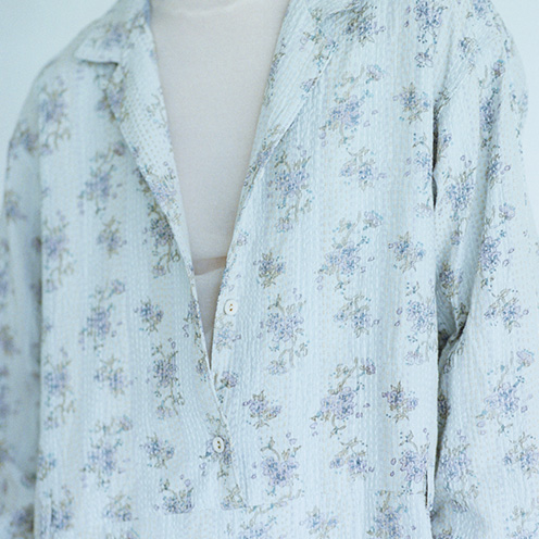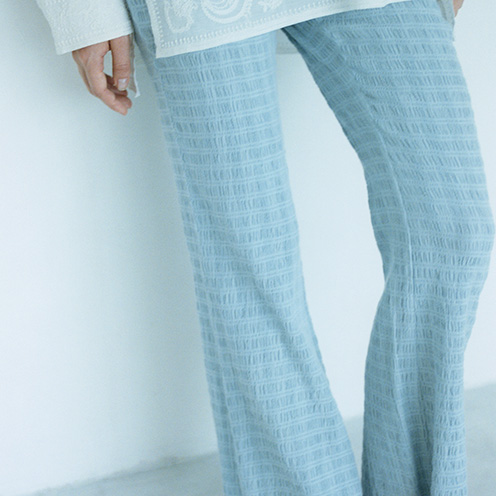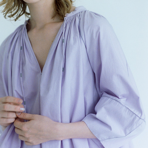 シルエットは、柔らかく軽い素材を活かし、長めの袖丈や着丈に設定しています。足首や手首でたるませ、ゆとりを楽しんでご着用ください。