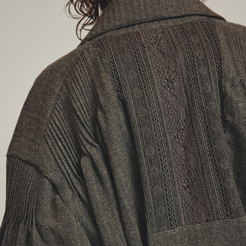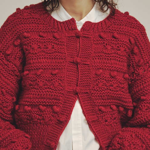 手編みならではの太番手の凹凸が特徴的な複雑な編み柄で仕立てています