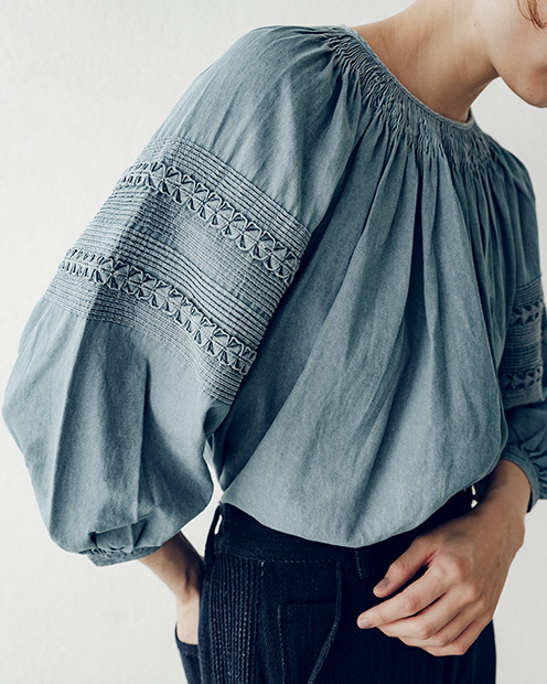 一般的にカディは、いかに細い糸で薄く織り上げるかを重視しますが、相反してPheetaでは、極限まで太い糸を高密度に織り上げることで、手織りならではの柔らかな風合いを追求してきました。ʻBettyʼは、そうした Danieleの経験から生まれた、手織りのツイード生地によるシリーズです。サックスとベージュの二色で製作。機械紡績糸を自動織機で織り上げた均一な生地とは異なり、一点ごとに異なる微細な表情や厚みがあり、着るたびに温もりを感じられるのが魅力です。また、メタルボタンは「宝石の街」と呼ばれるジャイプールにて、ひとつひとつ製作しています。街で見かける美しい孔雀をモチーフにあしらい、インドならではの美意識を宿したボタンに仕上げました。