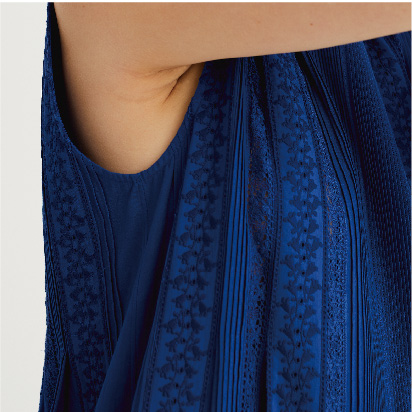 刺繍図案は、変幻自在な水に、女性の自由を重ね合わせ、雫に集まる美しい植物や水鳥、雨をイメージして書き起こしました。また生地は、シルクと似た特徴をもつレーヨンを混紡した