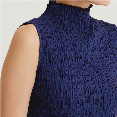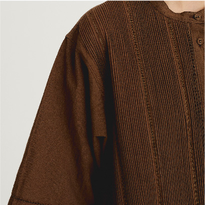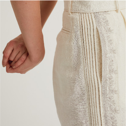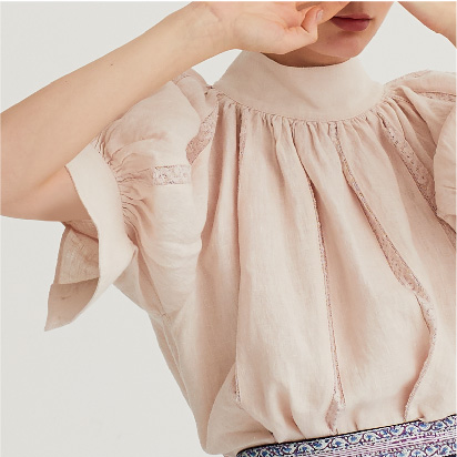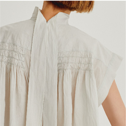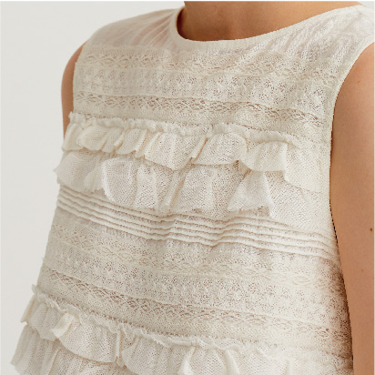 テープやリボンなどの様々な素材をステッチと一緒に縫い付ける手法を「コード刺繍」といいます。古くはヨーロッパのエンブレムにも用いられた立体感のある仕上がりが特徴の刺繍ですが、Pheetaでは、繊細な生地と組み合わせることにしました。この‘Flora’は、コード刺繍を用いた、自由な女性の機微に触れるシリーズです。